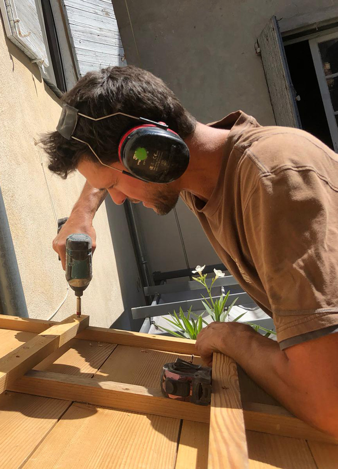 Adepte de la construction bois depuis ses débuts, il évolue des ateliers et chantiers de maisons ossature bois angevines aux charpentes parisiennes, en passant par l’isolation écologique, il fait ainsi ses armes dans diverses entreprises plusieurs années. Il renoue ensuite avec les bancs d’école pour se former à la conduite de travaux et continue son chemin dans différentes structures à ce poste. Il rejoint d’abord la SCOP pour participer autant aux chantiers qu’à la préparation des devis, l’essentiel pour lui étant ce travail en équipe, coopératif.